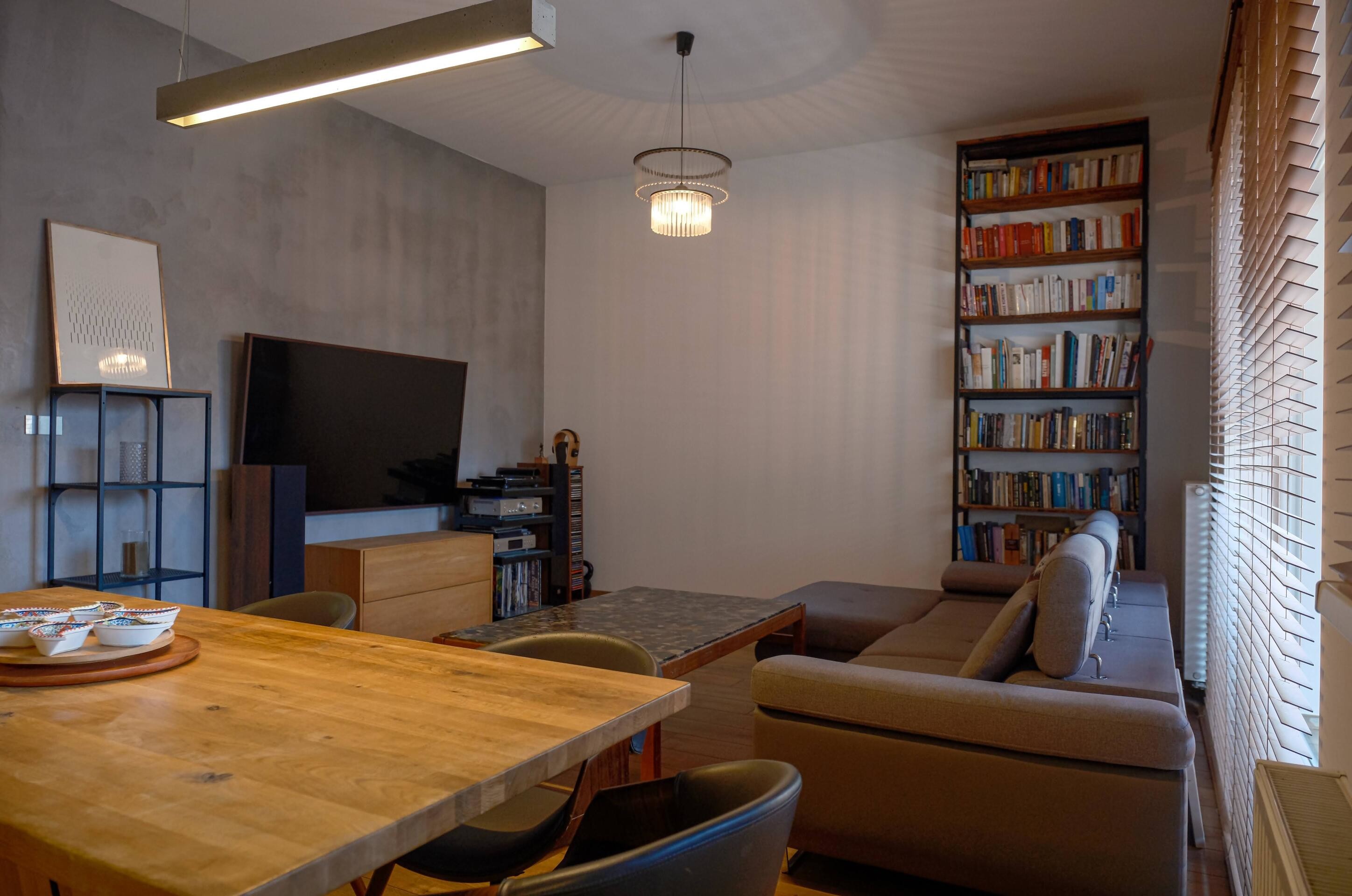 - dużego salonu połączonego z kuchnią i wyjściem na duży balkon / taras