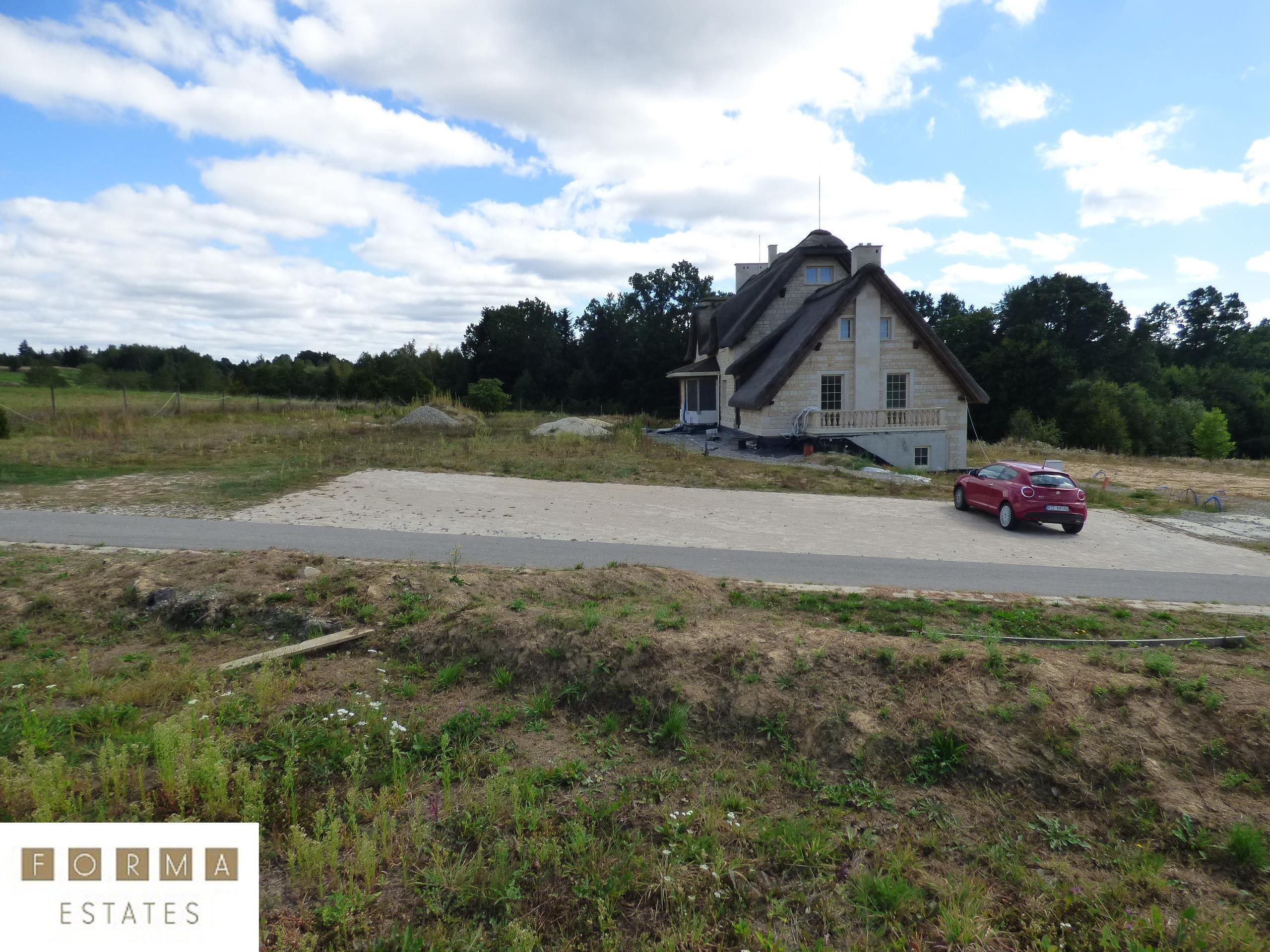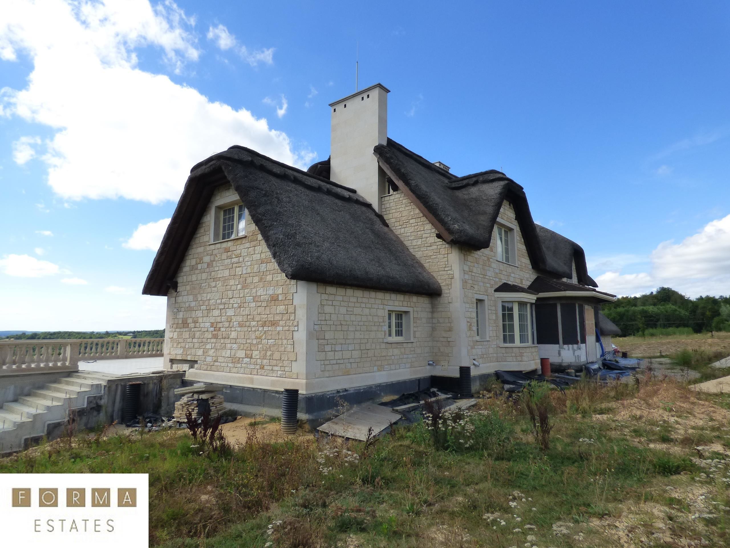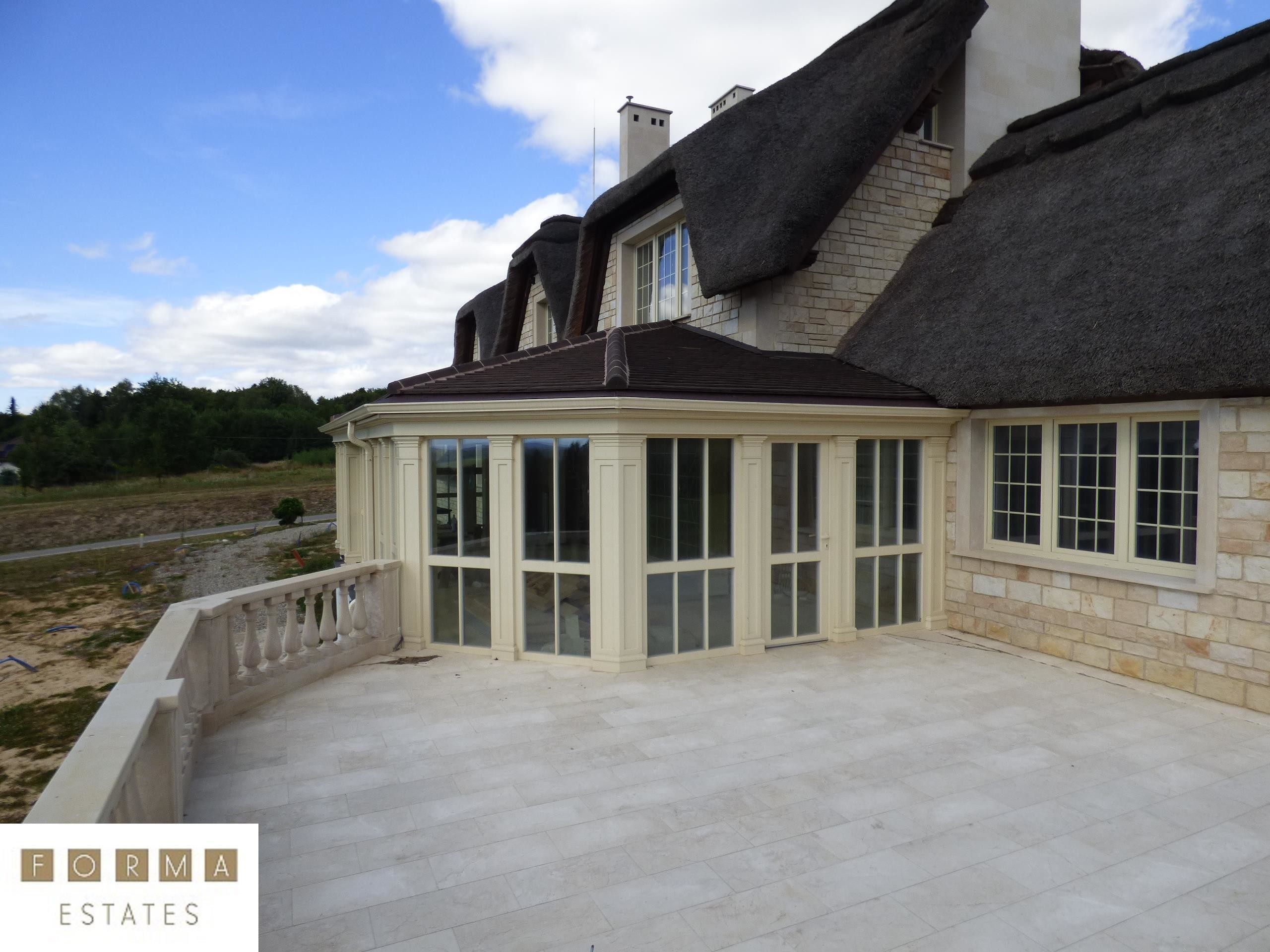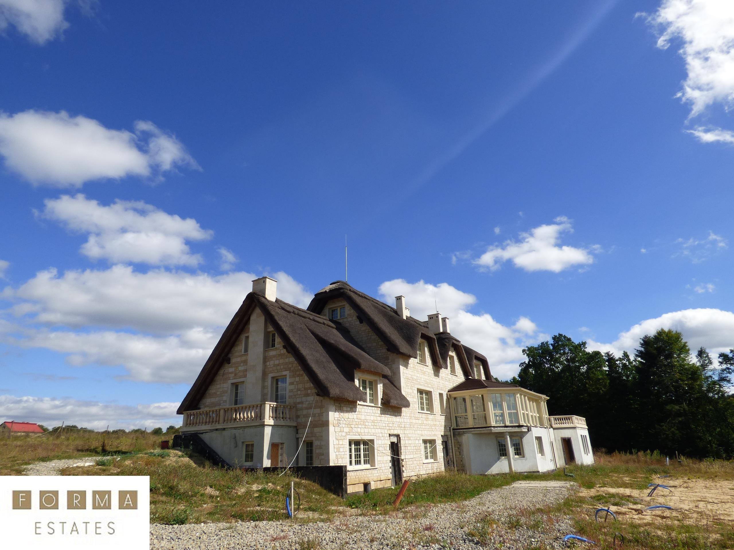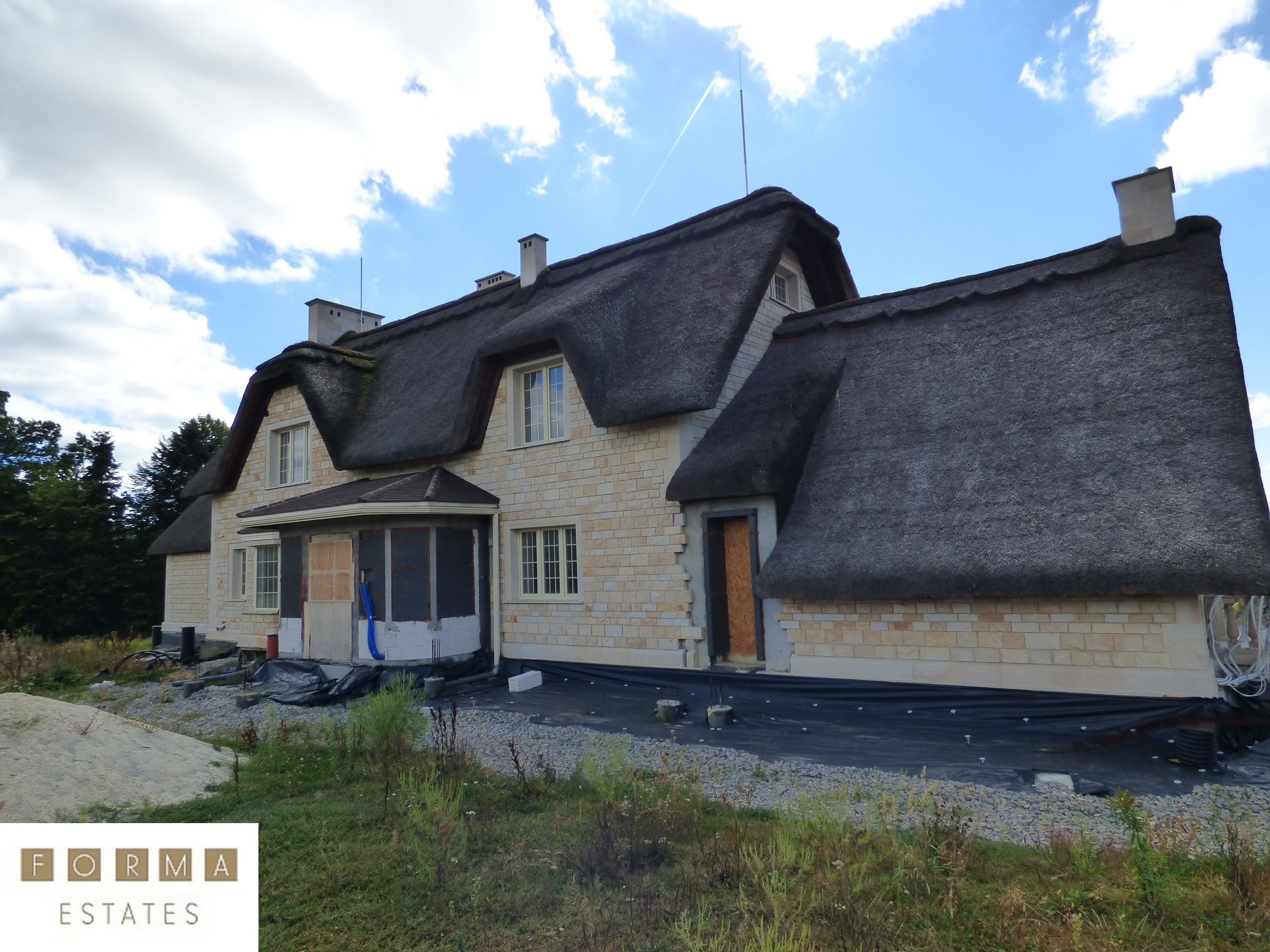 Nieruchomość powstała z materiałów najwyższej jakości. Budynek stworzono z pustaka ceramicznego, ściany obłożono bloczkami z piaskowca, dach został pokryty prawdziwą strzechą na wzór angielskiego budownictwa. Rezydencja wyróżnia się oryginalnością w porównaniu do innych projektów budowlanych. Dojazd do budynku drogą asfaltową. Ogrodzenie oraz brama elektryczna zabezpieczająca nieruchomość.